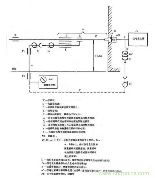 其中C是電流探頭,包括鐵氧體環和探測線圈,作用是測量電源線上的騷擾共模電流。D是鐵氧體環組,作為騷擾共模電流的穩定負載,吸收騷擾功率,并用于隔離EUT和電網。如果在50MHz以下鐵氧體環組D不能充分起到射頻隔離作用,則應在電網端再加一個輔助吸收鉗F,它也是由鐵氧體環組成。E也是鐵氧體環組,用于吸收外場在電流探頭引出電纜上產生的共模電流,以免影響測量結果。測量布置如圖19(b)所示,測試應在屏蔽室內進行,電源線長度應大于6m,即大于30MHz的半波長加上吸收鉗的長度。對于每一個測試頻率點,吸收鉗都應沿著電源線移動,找出最大值,因為共模電流在導線上是以駐波形式出現的。功率吸收鉗測量系統應事前進行校準,得到修正因子—頻率曲線。校準布置如圖20所示。