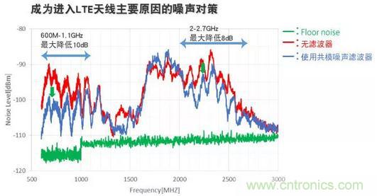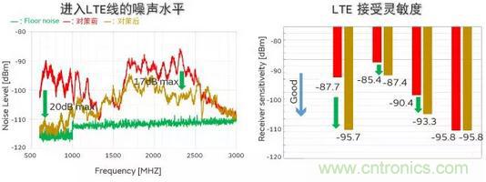 通過這些對策,如圖8所示,天線中進入的噪聲最大可降低20dB,LTE的接收靈敏度取決于頻帶,改善了8dB。