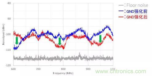 使用共模噪聲濾波器的結果如圖5所示,進入天線的最大噪聲改善10dB。
