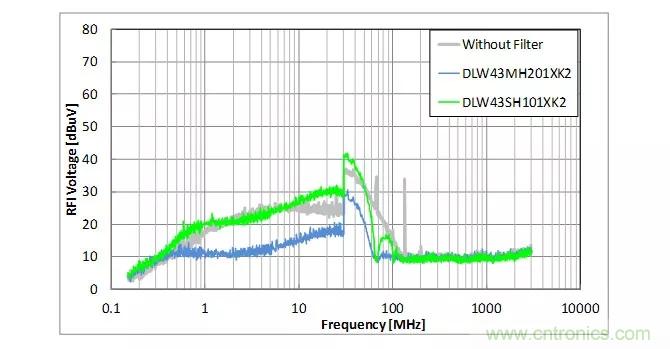 支持CAN、FlexRay的DLW43SH101XK2在有些頻率下噪聲會(huì)增加,降噪效果不佳,但使用支持100Base-T1的DLW43MH201XK2能有效地降噪。