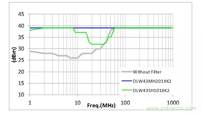 【導(dǎo)讀】支持CAN、FlexRay的DLW43SH101XK2在有些頻率下噪聲會(huì)增加,降噪效果不佳,但使用支持100Base-T1的DLW43MH201XK2能有效地降噪。