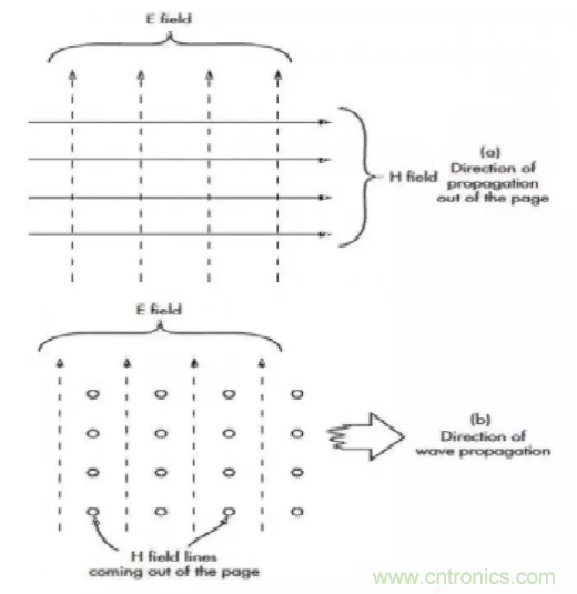 距離天線一定范圍內,電場和磁場基本為平面并以直角相交。注意傳播方向和電磁場均成直角。在圖2(a)中,傳播方向和電磁場線方向成正交,即垂直紙面向內或向外。在圖2(b)中,磁場線垂直紙面向外,如圖中圓圈所示。