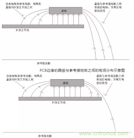 PCB邊緣的晶振與參考接地板之間的電場分布示意圖