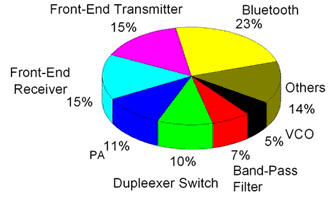 LTCC器件按其所包含的元件數(shù)量和在電路中的作用,大體可分為LTCC元件、LTCC功能器件、LTCC封裝基板和LTCC模塊基板。LTCC屬于高新科技的前沿產(chǎn)品,廣泛應(yīng)用于微電子工業(yè)的各個領(lǐng)域,具有十分廣闊的應(yīng)用市場和發(fā)展前景。目前LTCC 技術(shù)已經(jīng)進入更新的應(yīng)用階段,包括無線區(qū)域網(wǎng)絡(luò)、地面數(shù)位廣播、全球定位系統(tǒng)接收器組件、數(shù)位信號處理器和記憶體等及其他電源供應(yīng)組件甚至是數(shù)位電路組件基板。例如,村田、三菱電工、京瓷、TDK、Epcos、日立、Avx等十多家開發(fā)的手機無線開關(guān)組件,NEC、村田和和易利信等開發(fā)的藍牙組件都是由LTCC技術(shù)制成的。此外,LTCC組件因其結(jié)構(gòu)緊湊,高耐熱和耐沖擊性,目前在軍工和航天設(shè)備中廣泛應(yīng)用,預(yù)計未來在汽車電子系統(tǒng)上的應(yīng)用也會非常普遍。CTS 公司已經(jīng)宣布將為汽車電子市場提供低溫?zé)Y(jié)陶瓷(LTCC)電路板。圖6為目前LTCC器件應(yīng)用領(lǐng)域所占比例。