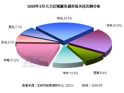 (圖)2009年3月七大區(qū)域服務(wù)器市場關(guān)注比例分布