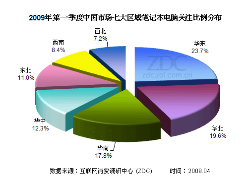 (圖) 2009年第一季度中國市場七大區域筆記本電腦關注比例分布