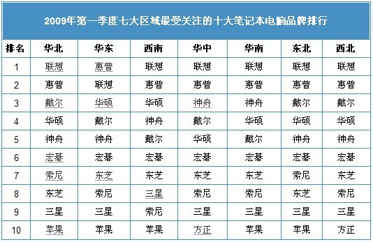 ZDC調查結果顯示,在全國七大區域筆記本電腦市場上,聯想與惠普的冠軍爭奪戰較為突出,最終聯想勝出,除華東地區的冠軍之位被惠普奪得之外,其他地區聯想均穩居冠軍的寶座。