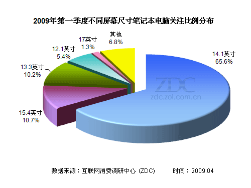 調查數據顯示,14.1是目前最主流的筆記本尺寸,第一季度獲得65.6%的關注比例。ZDC認為,目前14英寸筆記本是各大廠商的主打產品,其產品配置由高到低,可選擇范圍廣,外觀樣式也豐富多彩,同時經典產品更是層出不窮,在價格方面也要遠優于同性能的12、13英寸筆記本,所以這個尺寸的筆記本成為主流絕非偶然。