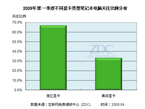 據ZDC 2009年第一季度的調查數據顯示,獨立顯卡筆記本更勝一籌,以66.8%的關注比例領先于集成顯卡機型。集成顯卡筆記本的關注比例為33.2%。二者的關注比例相差較大。