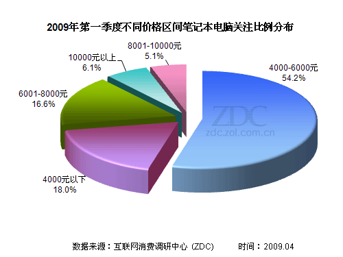價格是消費者購買筆記本考慮的重要因素之一,在筆記本市場競爭日益白熱化的今天,價格杠桿被不少廠商所利用,拼價格成為市場競爭的重要手段。那么,第一季度哪個價位段的筆記本占據市場主流呢?ZDC對不同價格區間產品的關注度進行了調查。