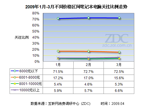 以下是2009年1月到3月不同價格區間筆記本的關注比例走勢狀況。