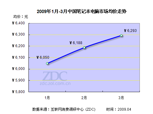 經過了幾年的價格洗禮,如今筆記本已經走近了尋常百姓家,再不是高不可攀的奢侈品。根據ZDC最新的均價調查顯示,2009年第一季度,筆記本市場均價為6000多元。1月份市場均價為6050元,2月與3月,筆記本市場嚴重缺貨導致價格出現上漲,市場均價在3月份達到了6293元。