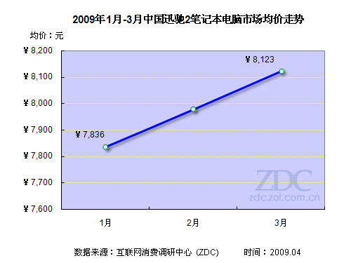 與整體市場的均價走勢一樣,第一季度迅馳2筆記本的市場均價呈現走高的態勢,1月份市場均價為7836元,2月份上漲至7978元,3月份達到了8123元。