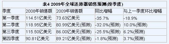 業界一致的看法是2009年連接器銷售額將下降25%左右。假定在今年后三個季度內,行業實現環比增長,則預測如果如表4所示。如此推算,世界連接器市場需到2009年第四季度或2010年第一季度才能再實現年度同比增長。