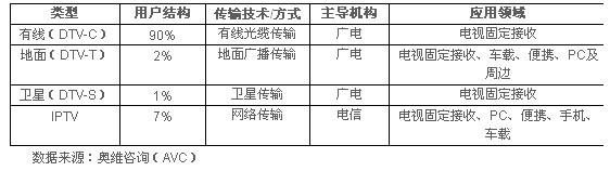 根據(jù)不同傳輸方式,中國DTV主要分為有線數(shù)字電視、地面數(shù)字電視、衛(wèi)星數(shù)字電視以及IPTV四種類型。(傳統(tǒng)意義上數(shù)字電視分有線、地面及衛(wèi)星三種類型。但AVC認(rèn)為,從應(yīng)用角度來講,IPTV是數(shù)字電視的一種特殊表現(xiàn)形式,故將IPTV也列入比較之列)