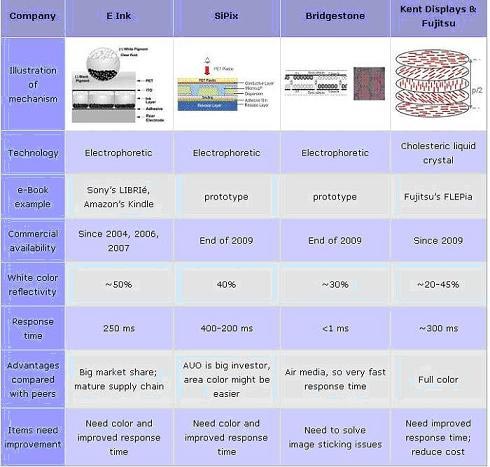 - 開發廠商正逐漸針對畫素反應速度、彩色化、可卷曲式基板、觸控面板整合等等不斷有新的進展