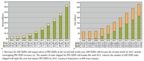 該市場研究公司還表示,雖然PM OLED顯示屏的單位出貨量到2015年將一直增長,但其收入將保持平穩。與此同時,AM OLED的單位出貨量將增加兩倍,并將在2011年超過PM OLED的出貨量(圖1b)。