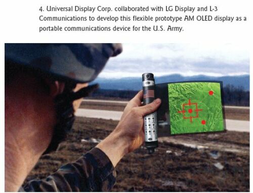 UDC演示了采用AM OLED的4英寸對角線原型。該原型的制造是UDC聯合LG Display和L-3 Communications的顯示系統部門一起完成的,它是ASU正在進行工作的一個補充(圖4)。UDC還在進行該顯示器觸摸屏版本的研發。