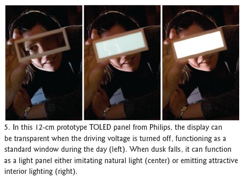 透明OLED(TOLED)可發出白光,它既可是PM又可是AM器件。他們只有透明組件:基板、陰極和陽極。當關閉時,它的透明度可達到其襯底透明度的85%,如飛利浦的12cm原型TOLED面板所示(見圖5)。