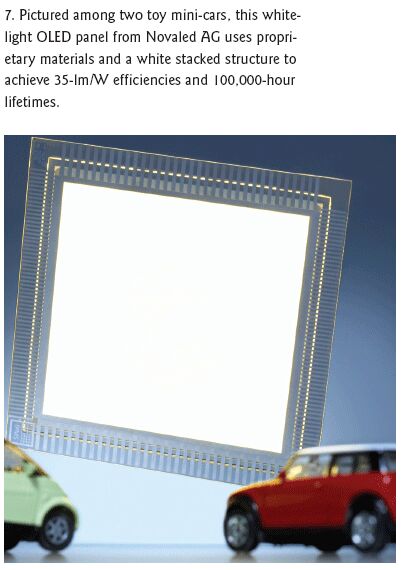 成員之一的歐司朗半導體公司去年展示了一款10×10cm的OLED面板,它在1000cd/m2條件下,具有30至50lm/W的光輸出,壽命為5000小時。在歐司朗這一工作的中間環節,還證明了OLED的白光輸出能比以前取得的較低水平有提高。歐司朗采用的是基本的真空沉積技術,使用的是小分子而不是可打印聚合物(圖6)。歸功于與BASF AG的合作,該面板的光輸出后增至60lms/W。