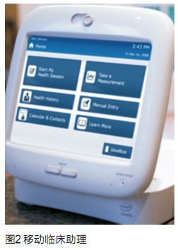 其次是醫療信息化產品,比如上海交大生物醫學工程研究所開發的生命體征監測無線服務平臺。平臺的核心就是一個多參數體征測量儀(iCare)、GSM模塊和網絡、智能分析軟件和服務器,可以部署在社區和醫院,這樣類似的系統國內已經成功地應用在工業控制中了,只要把多參數體征測量儀設計完善好,系統構建和實施難度不大。再如,Intel公司的移動臨床助理(Mobile Clinical Assistant)(如圖2),核心是Intel 高性能、低功耗移動便攜系統方案,可以很方便地布置在醫院病房、病人家里和醫生的診所,經過專業醫療儀器廠家的定制和生產,裝置已經完全符合醫療上的密封、消毒和安全的要求。國內嵌入式系統企業應該完全有能力設計出類似的裝置,而且如果采用國產ARM SoC 方案,體積還能更小,價格更便宜,功耗還能低。