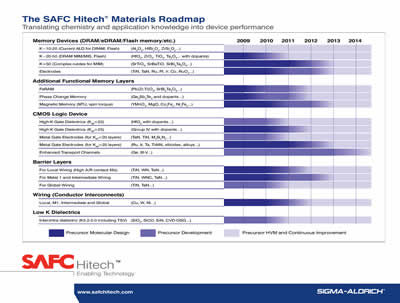 今年七月,在舊金山舉行的 Semicon West 展會上,我們針對硅半導體基底的化學氣相沉積 (CVD) 和原子層沉積 (ALD) 工藝公開了新的材料發展規劃。 規劃(圖 1 )概述了當前及未來先進的存儲和邏輯設備的發展道路,包括阻擋層、互連、介電材料和金屬,我們預期逐步推出,直至 2014 年完成。