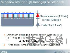 IMEC的目標是實現在硅底板上形成硅納米線的太陽能電池。硅底板的帶隙為1.1eV,而利用量子效應的硅納米線為1.7~1.8eV。組合帶隙不同的硅底板和硅納米線,可期待提高效率。Poortmans表示:“如果這一設想能夠實現,轉換效率將達到約33%”。