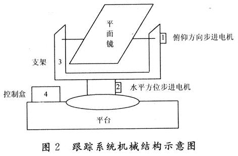 本文介紹的是一種基于單片機控制的雙軸太陽自動跟蹤系統,系統主要由平面鏡反光裝置、調整執行機構、控制電路、方位限位電路等部分組成。跟蹤系統電路控制結構框圖如圖1所示,系統機械結構示意圖如圖2所示。