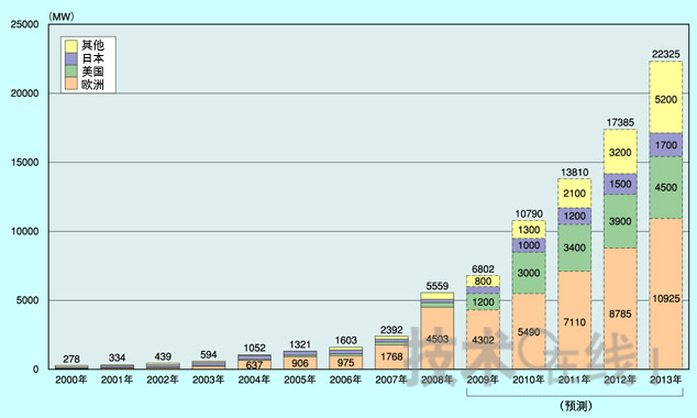 按地區分,2008年占全球需求量80%的歐洲市場預計2013年之前仍將保持首位。2010年到2013年將占全球需求量的一半左右。2013年歐洲市場的擴大率將為2008年的2.4倍,達到1萬925MW。雖然西班牙市場規模縮小,但德國、意大利和法國的需求將因入網電價制度而持續擴大。