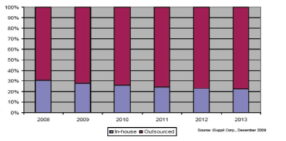 iSuppli公司對于內部及外部制造的機頂盒營業收入百分比情況的預測。