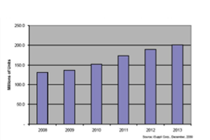 相對于2009年出貨量可能持平甚至下降的其他電子產品,例如2009年GPS便攜式導航設備市場可能會收縮0.7%,估計達4.2%的機頂盒市場年增長率可以說相對健康。對于未來,iSuppli公司仍認為機頂盒市場將繼續穩步增長,2008-2013年的復合年增長率將達8.9%。