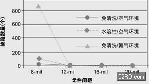 圖1顯示出三種不同組裝工藝的良品率情況。由圖可見,使用免清洗焊膏在空氣環(huán)境下進行回流焊產生的不良最少,總數為66個;使用水溶性焊膏在空氣環(huán)境下進行回流焊次之,不良有1,499個;使用免清洗型焊膏在充氮環(huán)境下進行回流焊產生的不良數最多,為5,665個。圖3還表明在充氮環(huán)境下以及焊膏助焊成分活性增大(水溶性焊膏)時,產生的不良數目會增多。