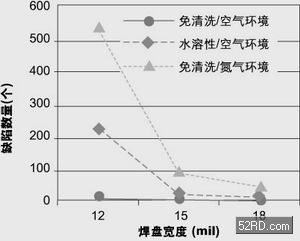 圖3是焊點不良與焊盤的寬度及組裝工藝的關系。這些數據是每種組裝工藝都選用最佳焊盤形式而得出的,試驗時將焊盤的長度和焊盤間距設為常量,只對焊盤寬度進行變化。通常來講,三種組裝工藝的良品率均隨焊盤寬度增大而提高,而不良率在焊盤寬度為0.012到0.015英寸之間較為敏感。水溶性焊膏在空氣環(huán)境中焊接和免清洗焊膏在充氮環(huán)境中焊接都是在焊盤寬度最大即0.018英寸時焊點缺陷最少,但這種情況在免清洗焊膏空氣環(huán)境下焊接時有一些改變,此時最高良品率是在焊盤寬度居中時(0.015英寸)得到的,然而由于使用這種工藝組裝的板子產生的不良數量非常少,所以焊盤寬度在0.015英寸和0.018英寸時不良數目之間的差異在統(tǒng)計上并不明顯。如果從組裝工藝的角度來看良品率變化趨勢,可以看到免清洗焊膏在空氣環(huán)境中焊接對焊盤寬度變化最不敏感,而免清洗焊膏在充氮環(huán)境下焊接工藝則對焊盤寬度變化最為敏感。