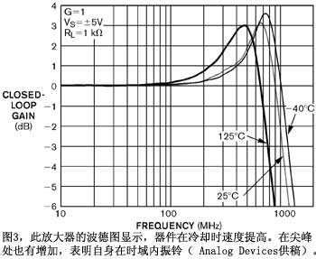 很多放大器,如AnalogDevices的AD8045,在冷卻時會加速(圖3),而有些放大器(如AD8099)則在變冷時會降速。已退休的LinearTechnology信號處理產(chǎn)品前副總裁兼總經(jīng)理BillGross稱:“雙極晶體管在低溫下遇到的多數(shù)麻煩是低電壓工作。”他認為,較高的基射電壓和較小的電流增益都更難于滿足規(guī)格要求。他說:“較低的輸入阻抗和b(電流增益)的不匹配都會造成低溫下的大問題。尤其是當它們?yōu)槭覝剡\行作了調整時。較高的gm(跨導)很容易通過改變工作電流而得到補償,但這樣的話轉換速率就會變化。”