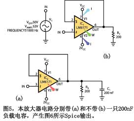如果你能確定IC通過信號的特性,就可以用Spice來估算功耗。此時必須保證使用恰當?shù)腟pice模型,它們對一些測試信號給出合理的結果,而功耗計算此時沒有價值。圖5表示一個Spice圖。芯片的功耗不同于到達負載的功率。圖6是圖5示意圖的Spice曲線圖。它以紅線表示啟動的振蕩。電路是否會發(fā)生這種振蕩只是個人的猜測,但它應該會使你在建立原型后查看這種行為。記住,在OrcadCapture上點擊W鍵只能顯示芯片的靜態(tài)功耗。要獲得工作時的功耗,要用示意圖上的功率標記,然后用曲線程序的rms-math函數(shù),給出器件的平均功耗。