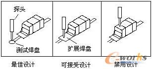 圖6所示為測試點設(shè)計的一個示例。通過延伸線在元器件引線附近設(shè)置測試焊盤或利用過孔焊盤測試節(jié)點,測試節(jié)點嚴(yán)禁選在元器件的焊點上,這種測試可能使虛焊節(jié)點在探針壓力作用下擠壓到理想位置,從而使虛焊故障被掩蓋,發(fā)生所謂的“故障遮蔽效應(yīng)”。由于探針因定位誤差引起的偏晃,可能使探針直接作用于元器件的端點或引腳上而造成元器件損壞。