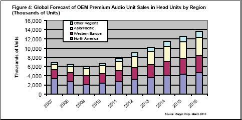 北美是車用高端音響系統(tǒng)的最大市場(chǎng)。該地區(qū)OEM高端音響單位出貨量預(yù)計(jì)到2016年將增長(zhǎng)到460萬套,而2007年是330萬。