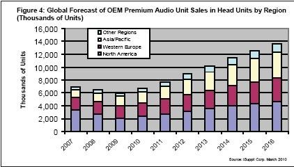 - 全球車用高端音響系統的出貨量在2010年將以兩位數速度增長