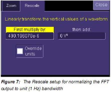 噪聲的頻域測量更加常用。頻域的大多數測量是功率譜密度。功率譜密度通常用 V2√Hz表示。Figure 5,跡線F2是通道2(1000個采樣點)的平均FFT。盡管示波器提供功率譜密度作為FFT輸出類型,但仍使用對數dB。改成幅度平方輸出類型,單位是V2,FFT的設置如Figure 6 所示。除了輸出類型,選擇矩形加權和首要因素FFT(Least Prime Factor FFT)。注意FFT的設置分辨率帶寬(RBW)該處是1.02kHz,當然還有加權函數為1.000的矩形加權函數的等效噪聲帶寬(ENBW)。