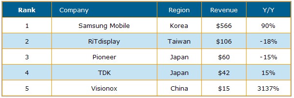 從供貨商排名來看,Samsung Mobile Display遙遙領先其它廠商以5億6千6百萬美元居冠,年成長率高達90%;臺灣錸寶科技(RiTdisplay)以1億零6百萬美元排名第二,較去年下滑18%;Pioneer位居第三,出貨金額為6千萬美元較去年下滑15%;TDK出貨金額較2008年提高15%,維持第四名地位;中國大陸廠商維信諾(Visionox)出貨金額較去年成長達1千5百萬美元,排名第五。