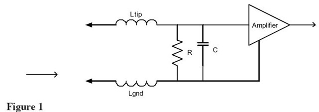 單端探頭有兩個(gè)輸入端——信號(hào)(尖端)和地。等效電路包括電感、DC電阻并聯(lián)的輸入電容和地夾的電感。地夾電感可以和尖端電感歸結(jié)在一起以簡(jiǎn)化電路。有源探頭的等效電路如Figure1所示。給出的電感有兩個(gè)——尖端和地夾電感。地夾電感通常占主導(dǎo)地位并依據(jù)用戶連接待測(cè)系統(tǒng)地的方式而改變。