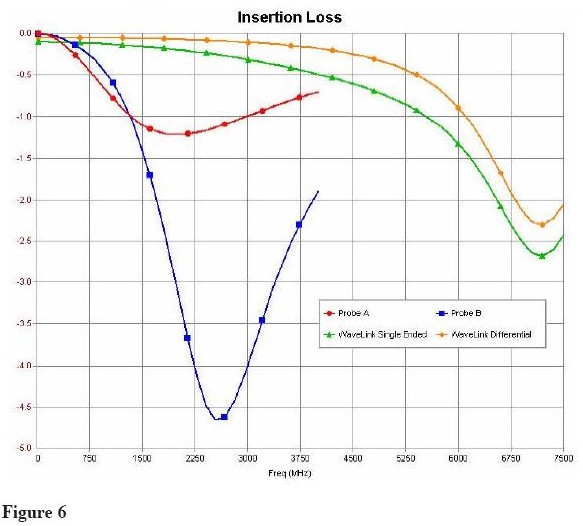為了比較差分探頭的性能,通常在良好定義和常數(shù)電路中畫(huà)出負(fù)載效應(yīng)。比如,每個(gè)探頭在50歐姆理想環(huán)境中產(chǎn)生的插損如Figure 6所示。插損用dB表示;作為電壓表示,必須除以20,采用反對(duì)數(shù)。比如Probe B導(dǎo)致的4.6dB的插損會(huì)產(chǎn)生41%的幅度損失。這對(duì)于被探測(cè)的信號(hào)有顯著影響。