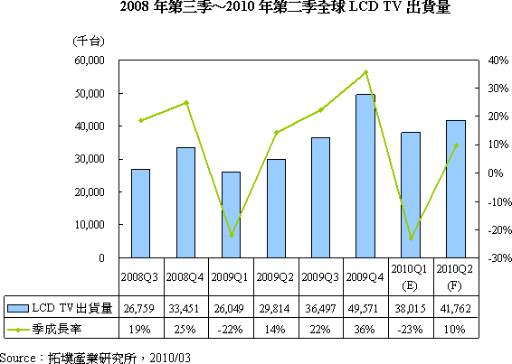 每年第一季歐美地區(qū)普遍缺乏節(jié)日刺激銷售,因此當(dāng)季全球LCD TV出貨量往往呈現(xiàn)衰退狀況。雖然業(yè)界期望中國春節(jié)能改變第一季衰退的命運(yùn),但2010年春節(jié)中國市場LCD TV銷售量僅214萬臺(tái),遠(yuǎn)低于各界預(yù)估的400萬臺(tái)。拓墣產(chǎn)業(yè)研究所張乘維經(jīng)理估計(jì),2010年全球LCD TV首季出貨量僅3,802萬臺(tái),較2009年第四季下滑23%。