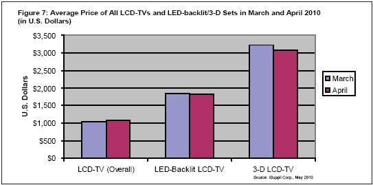 圖7所示為2010年3月和4月整體液晶電視與LED及3D電視平均價(jià)格的對比。
