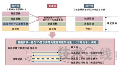 關(guān)于②,由于開發(fā)品需要采用開關(guān)液晶面板,因此厚度大于普通2D液晶顯示器不可避免。于是夏普將目光投向了逐步被普通手機(jī)及智能手機(jī)等采用的觸摸面板。具體方法是,將開關(guān)液晶面板與觸摸面板合為一體(圖1)。注3)這是通過在開關(guān)液晶面板的正面形成靜電容量式觸摸面板用電極而實(shí)現(xiàn)的。據(jù)介紹,通過這種方法,實(shí)現(xiàn)了與配備觸摸面板的2D液晶顯示器同等的厚度。