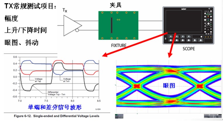 對于絕大多數高速串行信號的測量,通常包括了發送端測量和接收機測量,又稱為TX測量和RX測量。目前,對于板級設計的硬件工程師,對發送端測試已經非常熟悉。通常使用高帶寬示波器加上測試夾具或差分探頭來測量,測試項目主要是眼圖、抖動、上升/下降時間、幅度等等,探測點的位置一般是串行鏈路的發送端或接收端,由于測量的都是高速收發器芯片發送出的信號,對于這一類測試通常都稱為發送端測試,如下圖2為典型的TX測試的示意圖。