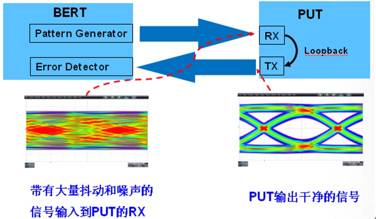 圖3為接收機測試的示意圖。接收機測試所需的儀器是誤碼率測試儀(簡稱BERT),BERT通常包括碼型發生器(Pattern Generator)和誤碼檢測器(Error Detector)兩部分。在接收機測試時,碼型發生器輸出特定碼型的、帶有大量抖動和噪聲的信號到待測試產品(Product Under Test,簡稱PUT)的RX,PUT接收到后通過時鐘與數據恢復電路(簡稱CDR)、判別電路和解碼得到1和0組合的比特流,然后環回到輸出寄存器,從PUT的TX緩沖器發送出去,PUT的TX連接到了BERT的誤碼檢測器,誤碼檢測器中的CDR、判別電路處理后解碼得到1與0組合的數據比特流,然后與碼型發生器輸出的特定碼型數據對比,如果兩者完全吻合則沒有誤碼,否則,記錄下誤碼的數量和接收到的碼流的比特總數,前者除以后者即誤碼率,同時記錄接收到誤碼時碼型發生器輸出信號的抖動值。如果用示波器測量PUT的RX端接收到的信號的眼圖,通常是閉合的,如圖3的左下圖所示;如果用示波器測量PUT的TX端輸出信號的眼圖,通常是良好的眼圖,如圖3右下圖所示。修改碼型發生器輸出信號的隨機抖動、固有抖動、信號幅度等參數,可以快速評估PUT的接收機性能。