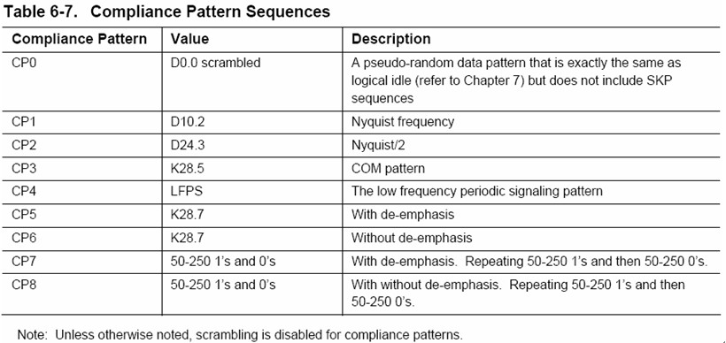 在USB3.0規范中定義了多種兼容性測試碼型(Compliance Pattern,簡稱CP),如下圖4所示包括了CP0-CP8九種測試碼型。在TX測量中,需要用到CP0/CP1/CP7/CP8四種碼型:CP0用于眼圖與抖動、共模電壓測量;CP1用于SSC展頻測量、隨機抖動測量;CP7用于去加重測量;CP8用于差分電壓幅度測量。