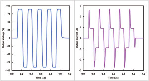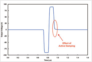 我們可以直觀地理解超聲波發(fā)送器輸出的對(duì)稱性要求。然而,這里需要深入理解的是輸出信號(hào)不必為一個(gè)長(zhǎng)脈沖群。它可能包括一個(gè)單正極和負(fù)極脈沖對(duì),脈沖對(duì)的前后均為0V。同樣,信號(hào)歸至0V的質(zhì)量變得至關(guān)重要。有時(shí),它被稱為“阻尼”函數(shù)(見圖3),并對(duì)一些超聲波模式產(chǎn)生巨大的影響,例如,人體非線性為主要信息源的諧波成像等。