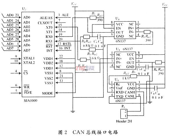 選用芯片82C250作為CAN控制器和物理總線間的驅動接口,可以提供對總線的差動發送能力和對CAN控制器的差動接收能力,其最高速可達1Mb/s。由于實際系統中存在干擾,故增加高速光隔6N137,以起到隔離的作用。電氣接口很簡單,有CANH和CANL兩根線,用以完成CAN的數據傳輸。在CAN總線的兩端有一個120Ω的電阻,其作用為匹配總線阻抗,用于提高數據通信的抗干擾性及可靠性。具體電路如圖2所示。